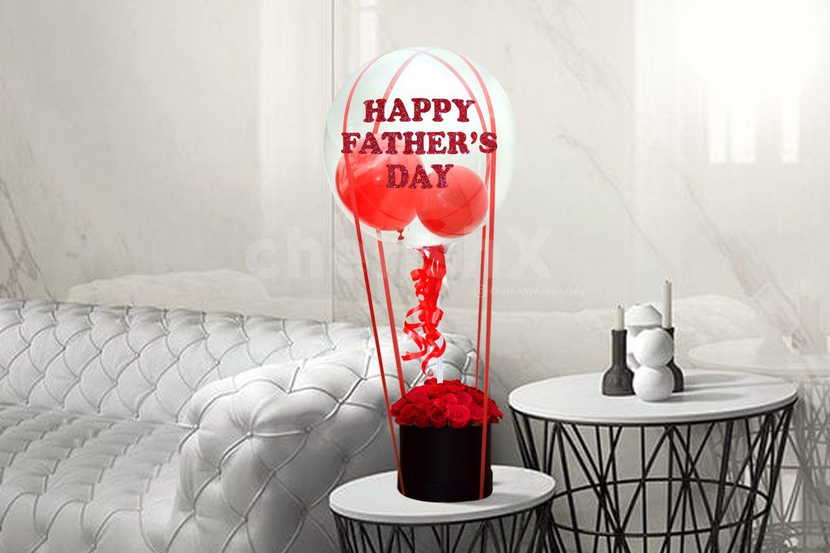 "Ever seen a hot air balloon? Isn't it amazing and fascinating to say the least? Well, that's why we have crafted perfectly and exclusively for you a miniature version of it. This gift is perfectly suited to surprise your DAD this father's day! This visually appealing present consists of 1 bucket of resplendent, blooming and fragrant roses, in a deep red color! The other component of this gift is one customized helium see- through balloon filled with 2 red heart balloons. A treat to the eyes! What's more, this surprise can be delivered to an address of your choice, anywhere in Delhi-NCR. so you can get it directly delivered to your daddy dearest!