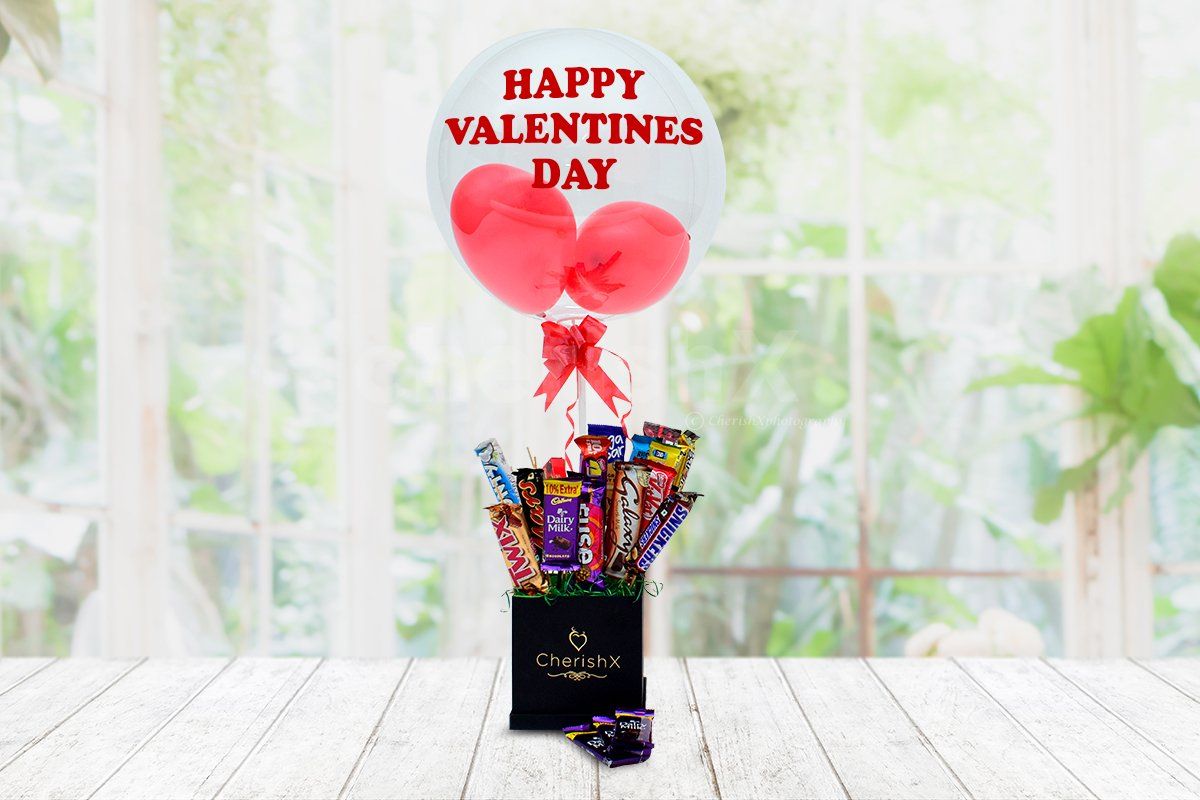 A transparent balloon with a bucket of 12 different chocolates for all kinds of chocolate lovers.