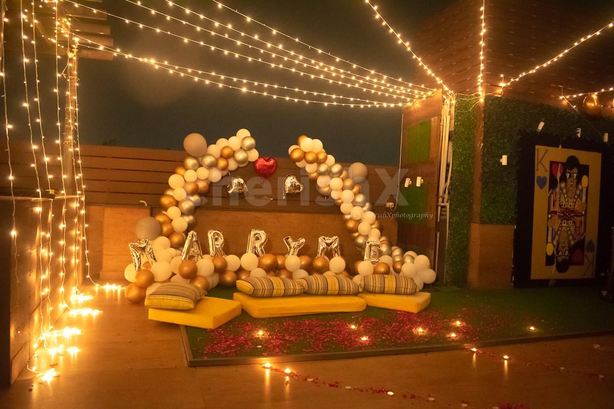 Believe it or not, women dream about the day when Mr. Right will propose to them and hope the day is perfect in every imaginable way. So if you want to make your proposal both memorable and successful, We are here to help you. CherishX encourages you to express yourself to the fullest with our Terrace proposal Decor. The entire setup comprises 13 strings of LED lights, “Marry me” or “I Love you” foil balloons, 2 silver heart shape foil balloons and 1 Red heart shape balloon along with this 2 beautifully curated arch by silver chrome, golden chrome and pearl white balloons with a big red heart made with rose petals and candles- your better half will be truly swept off their feet.