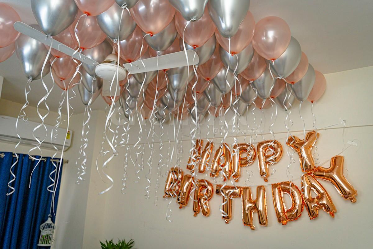 Around 60 to 70 balloons with ribbons are placed on the ceiling and rest are placed in the form of bunches or free floating on floor according to you