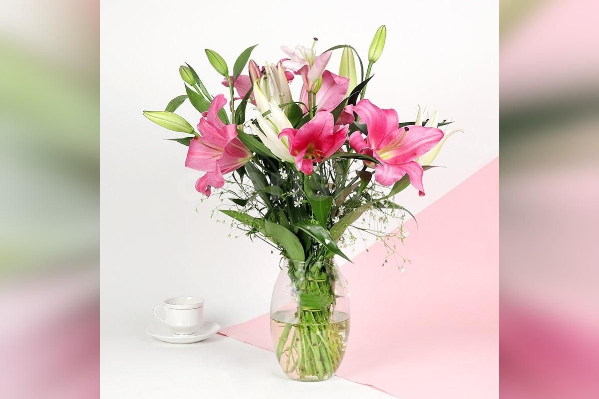 CherishX 6 Pink and White Lilies in Cylindrical Glass Vase Bouquet is picked fresh from the farm and delivered in a beautiful package to your special recipient. Our 6 Pink and White Lilies in Cylindrical Glass Vase Bouquet is a classic but simple romantic gesture that will make them fall head over heels.