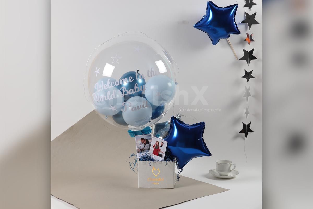 Book an Exclusive Blue Personalised Balloon And Photo Bucket for Gifting and Wishes on Baby Shower, Baby Welcome, Birthday, Anniversary and all other special occasions.