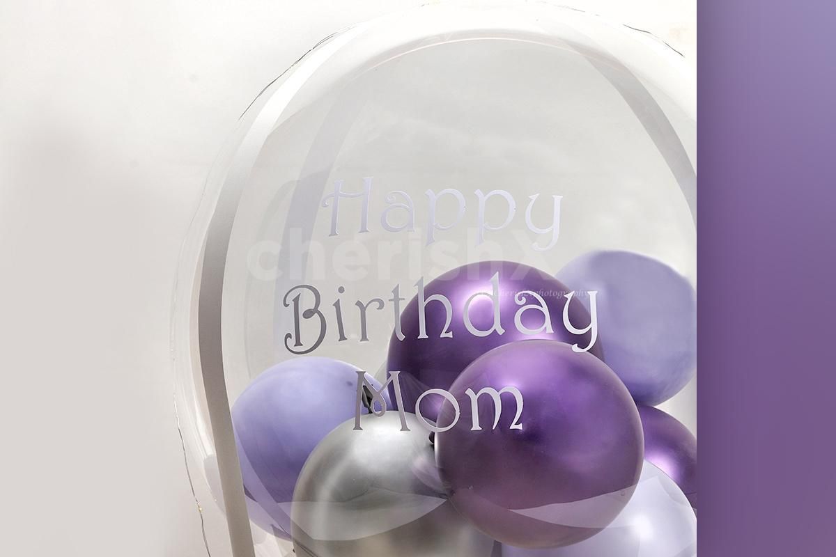 Bubble balloon filled with 3 purple chrome, 3 Purple Pastel & 2 Silver chrome balloons 1 White ribbon