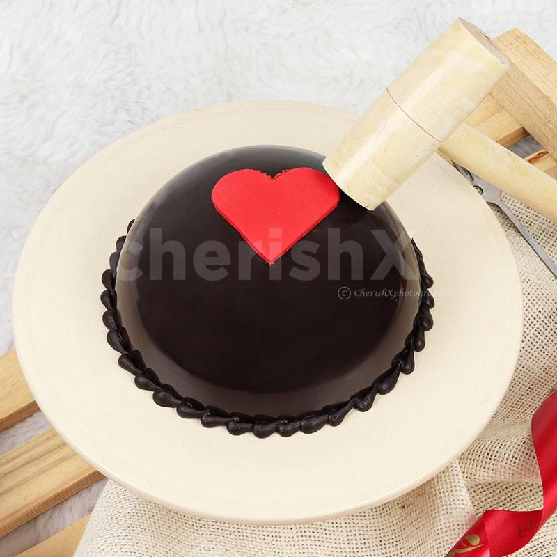 Pinata Cake is one of the trends when it comes to celebrating any accasion. It's super fun, delicious and it's all chocolate. Comes with a cutesy hammer to smash the chocolate shell & also a lovely tag. Hit With The Hammer to a very delicious red velvet cake with Icing all over and red velvet crumbs all around, Don't forget to win the fight over the Milk Chocolate shavings spread on top of the cake
