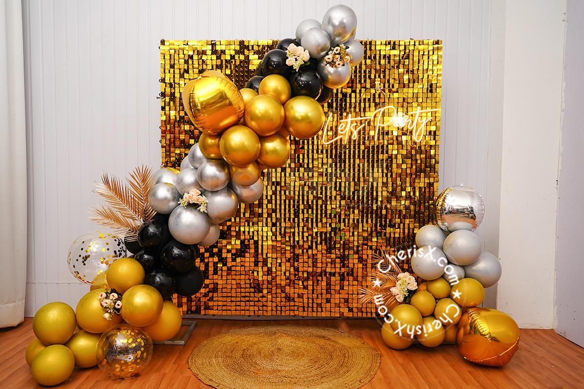 A beautiful arch of 62 balloons of color 24 Golden chrome, 20 Black latex and 20 Silver chrome balloons decorated with artificial golden leafs and 3 flower bunches