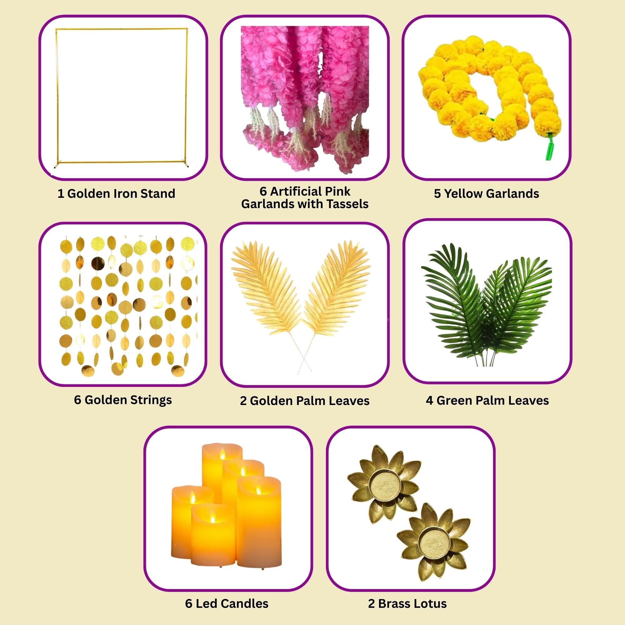 Included in this DIY garland Diwali puja backdrop are a rectangular stand, pink and yellow garlands with tassels, a lotus hanging, yellow rosettes, green palm, golden palm leaves, LED candles, and a lotus candle stand. We've curated everything into one box, allowing you to add your enchantment to your celebration. Recreate the stunning backdrop as seen in the photograph or unleash your creativity to adorn your home altar with these imaginative add-ons. With this kit, you won't need to scour marketplaces for anything else - just order online, and you're all set! And guess what? You can also gift this special puja decoration kit to someone on Diwali. Imagine their delight when they receive this auspicious and divine DIY decoration along with a box of sweets.