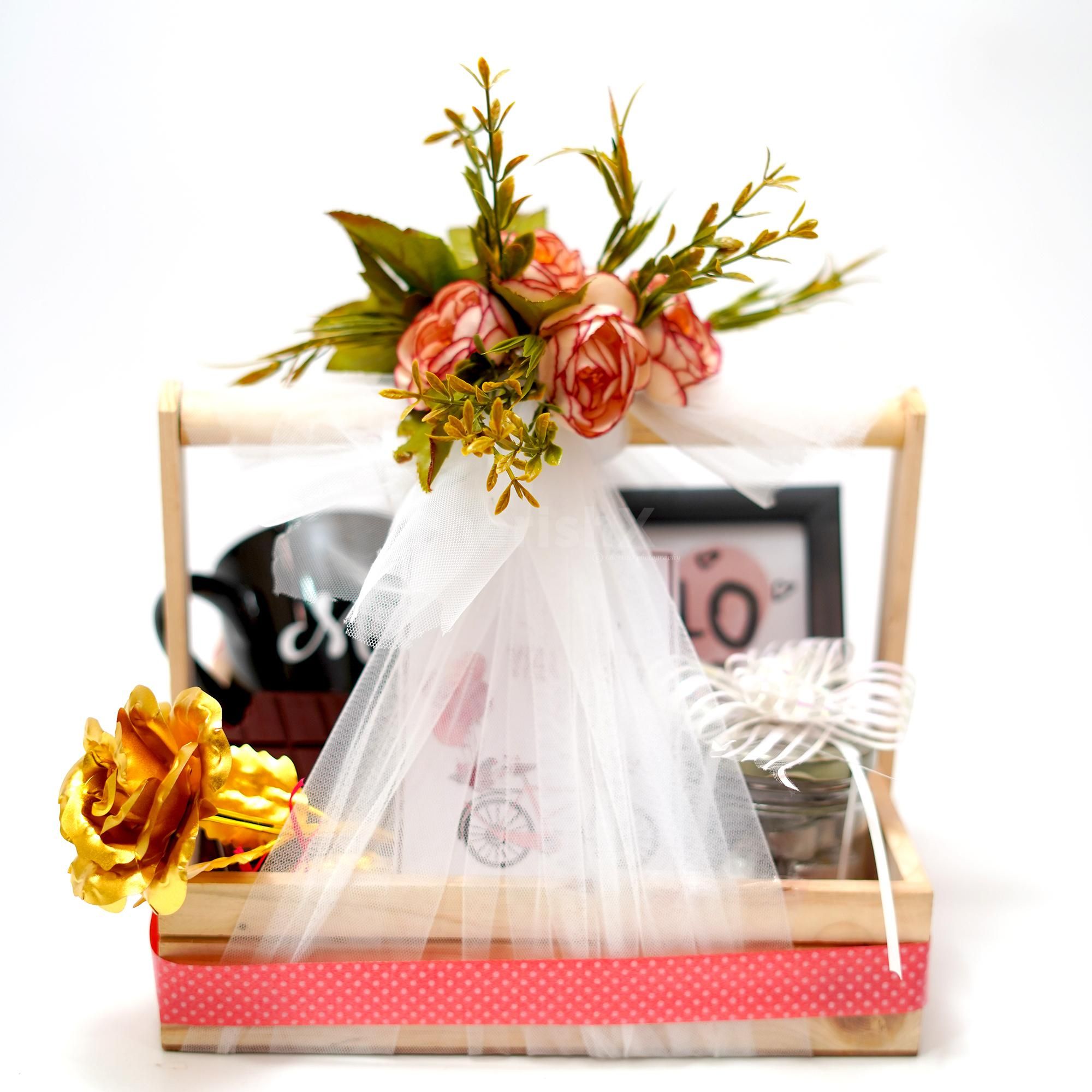 1 Wooden Handle Basket Decorated with Red Ribbon, White Net Fabric and Artificial Flower Bunch