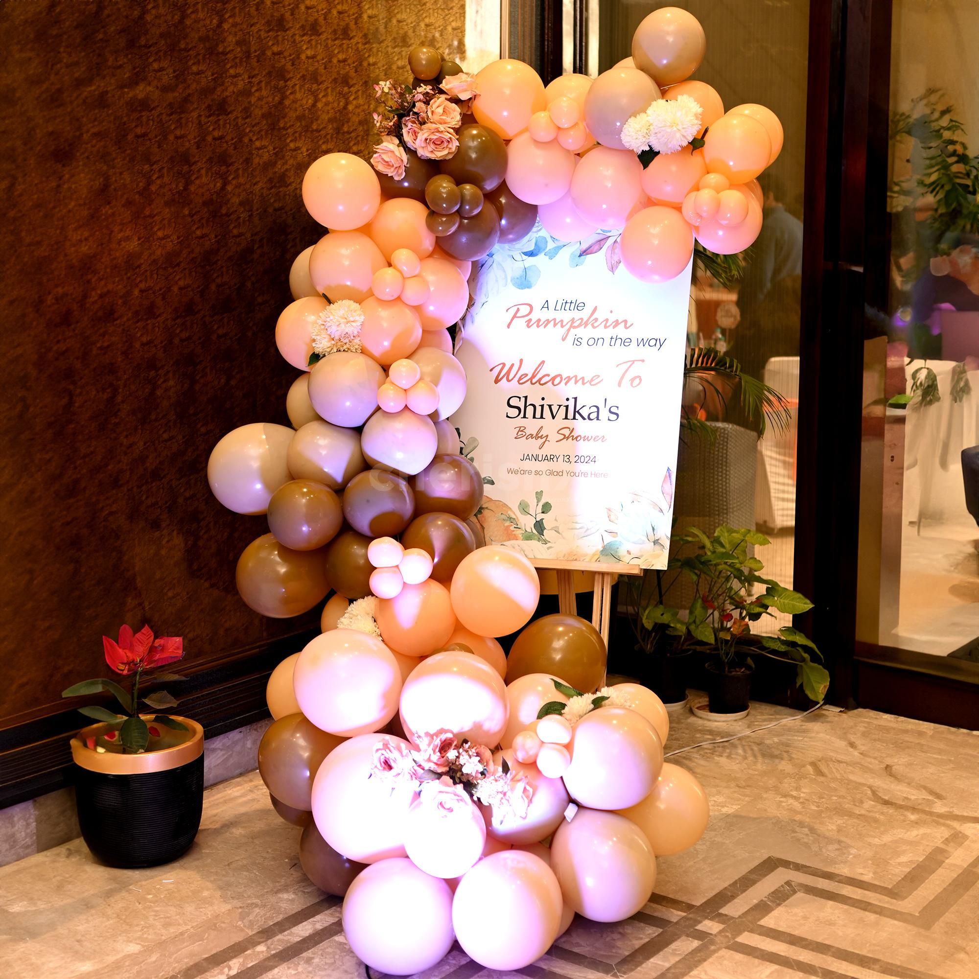 1 Theme Based Welcome Board With 4 Peach Flowers, 100 Theme Based Balloons Arrangement and 1 Disco Light