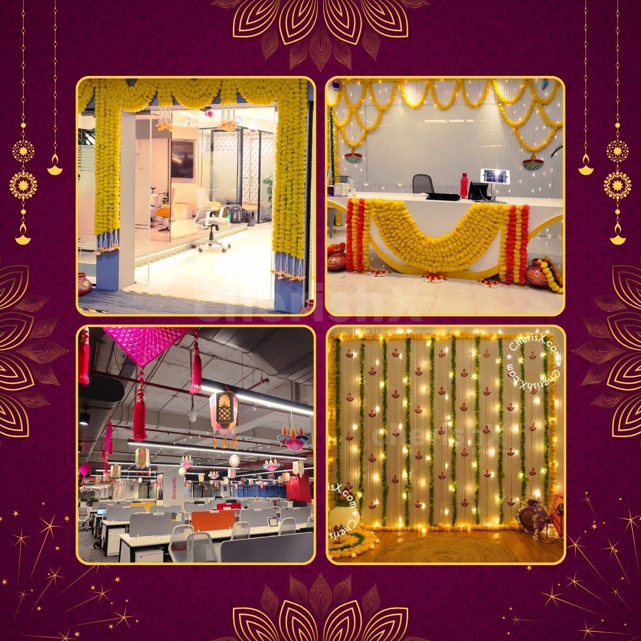 Diwali Office Decoration Package – Elegant Floral Garlands, Tassels, and Lights