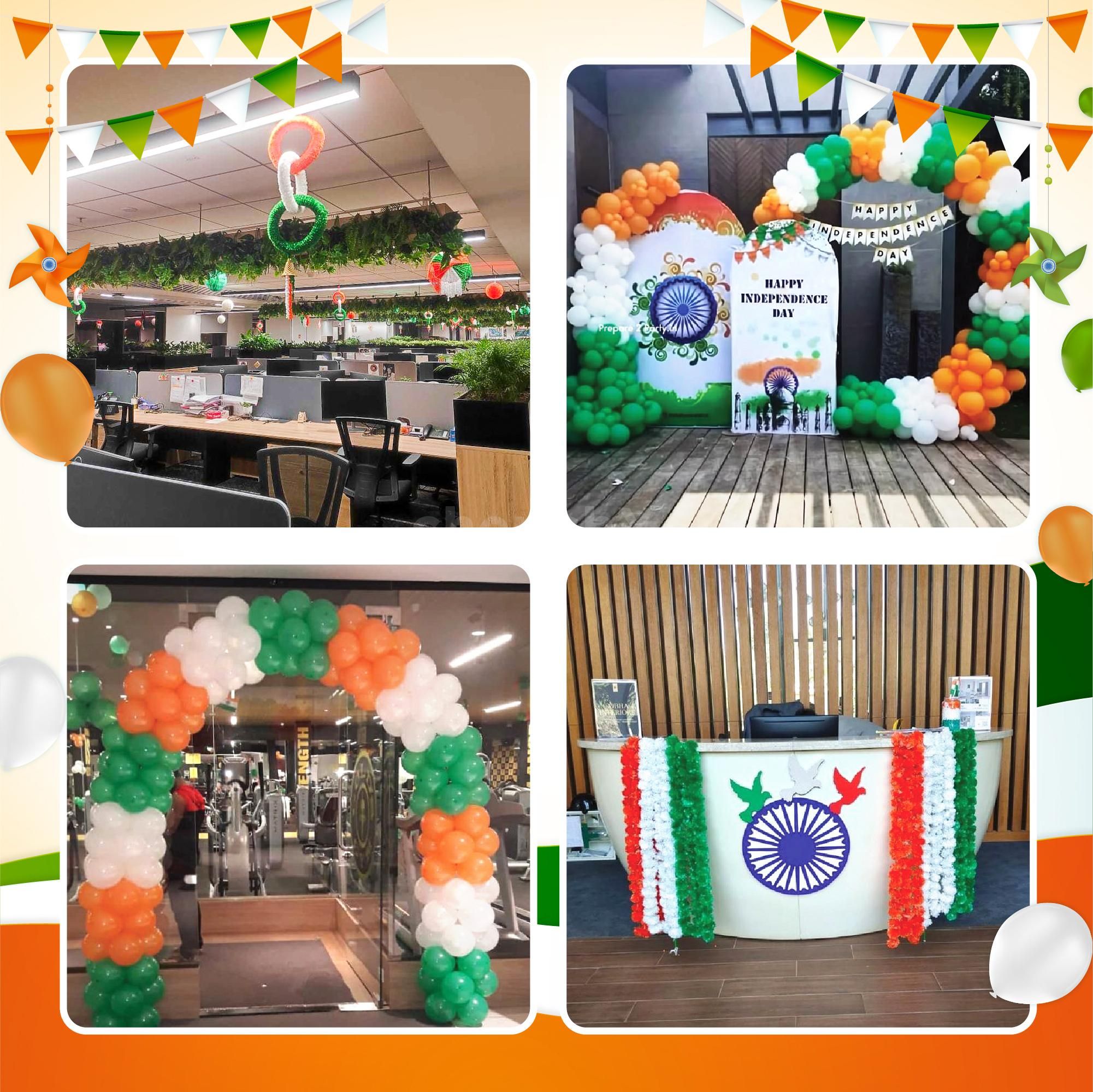 Backdrop of 6*3ft,5*3ft sunboard cutouts with stand and 6*6ft ring decor with balloons & Happy Independence day bunting