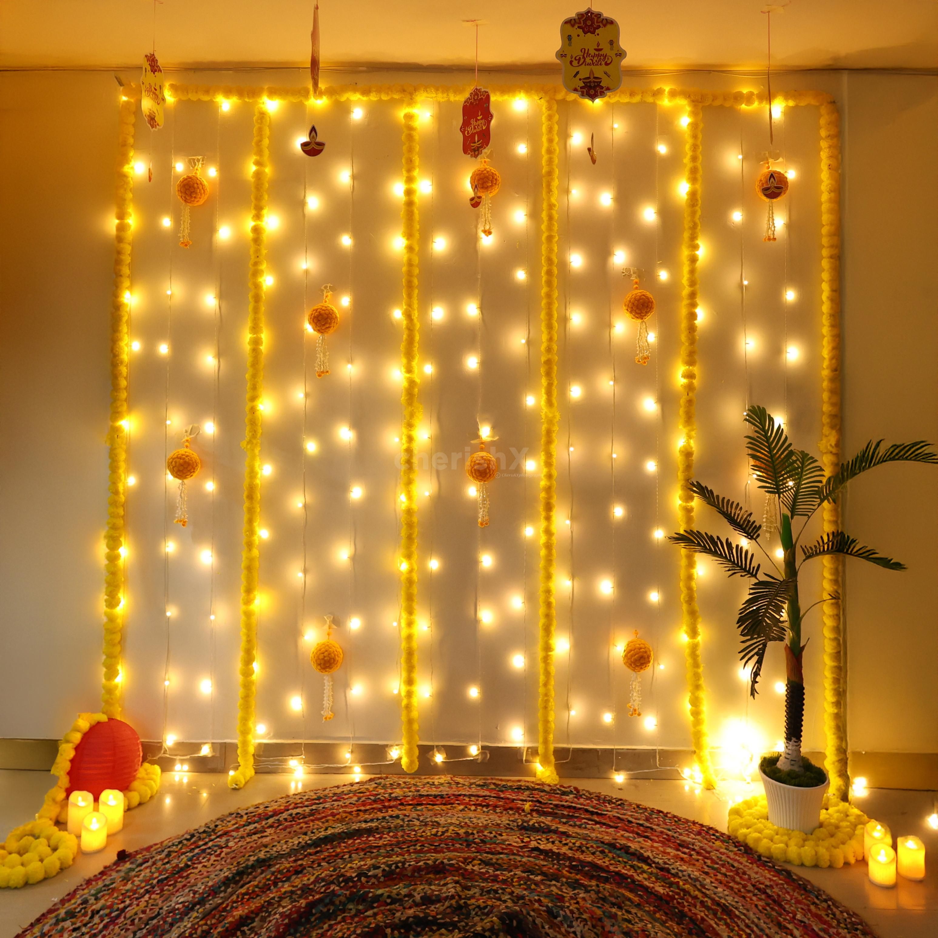 Fresh flower, fixed rangoli, ceiling danglers,led candles & MDF lotus can be added from customizations