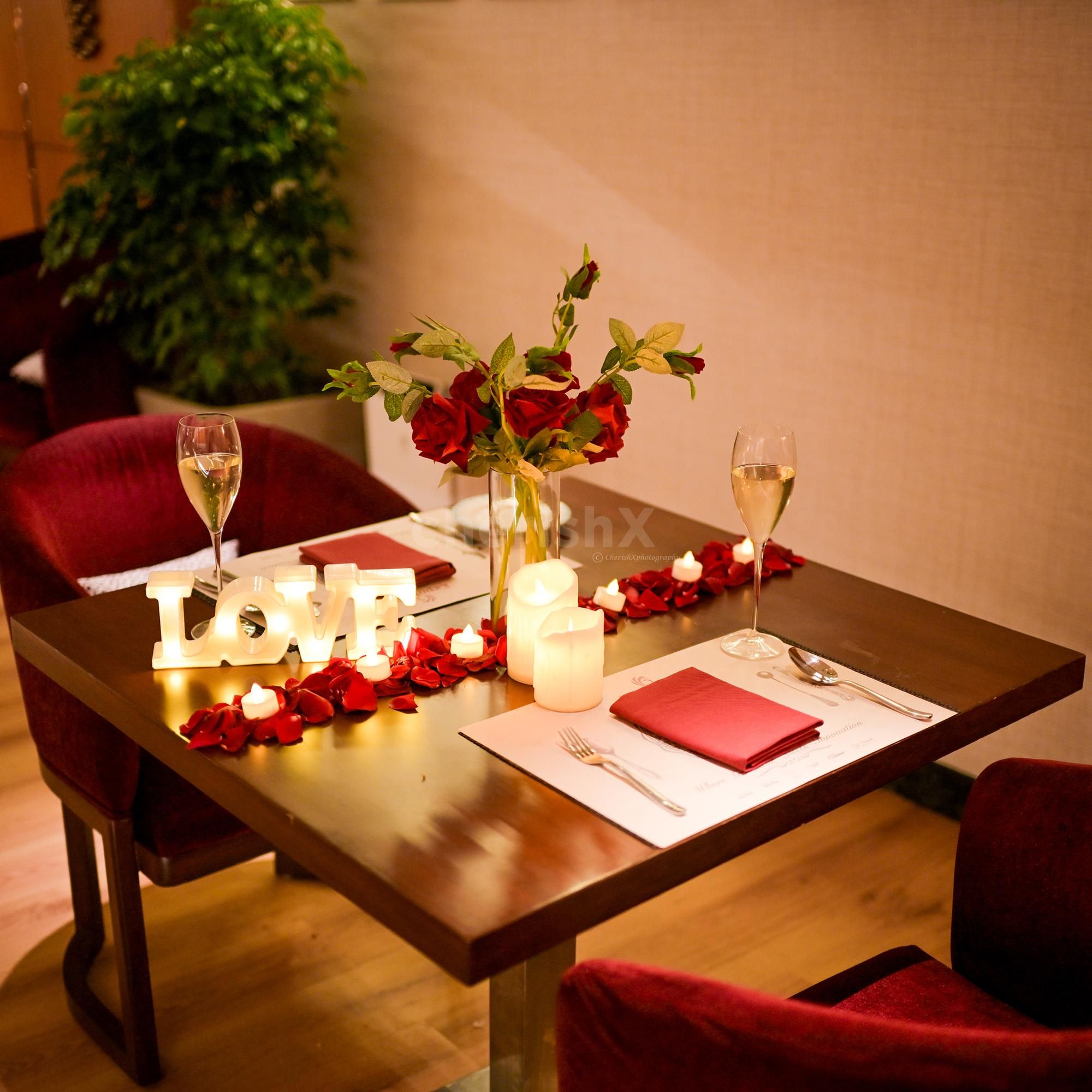 Decorated Table with LED Love, Rose petals and Candles for Dinner