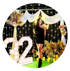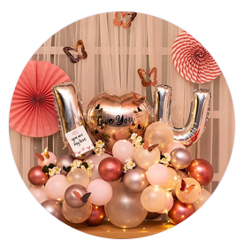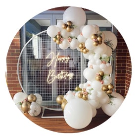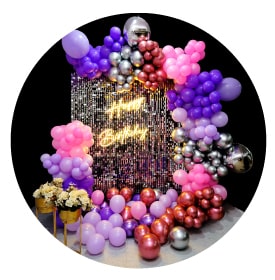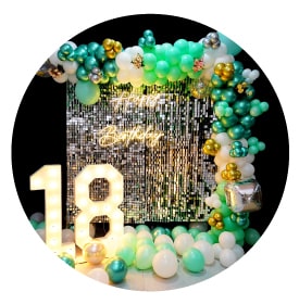 Our most popular birthday decorations are balloon decorations - either arches or walls, sequin backgrounds, neon sign decorations, and rings.