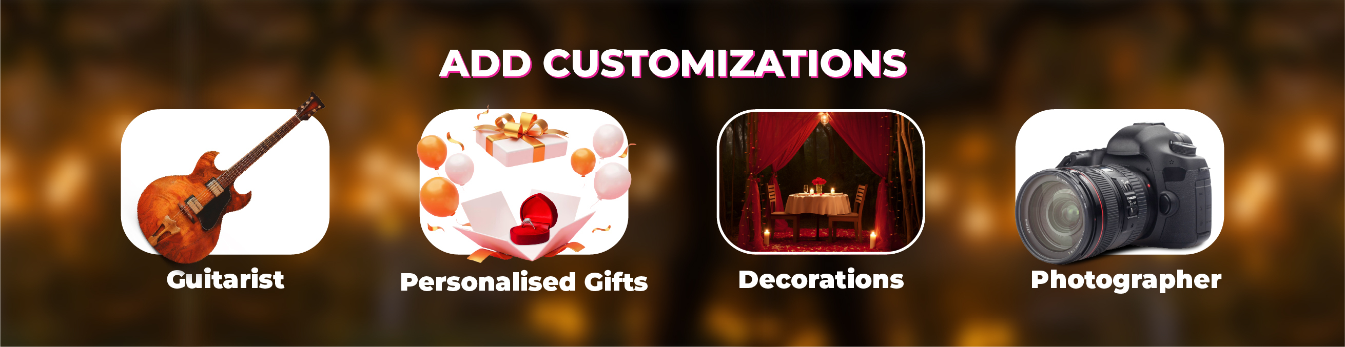 You can add customisations like Cake, Flower Bouquet, LED Letters, Guitarist, Photographer and even a extra person.